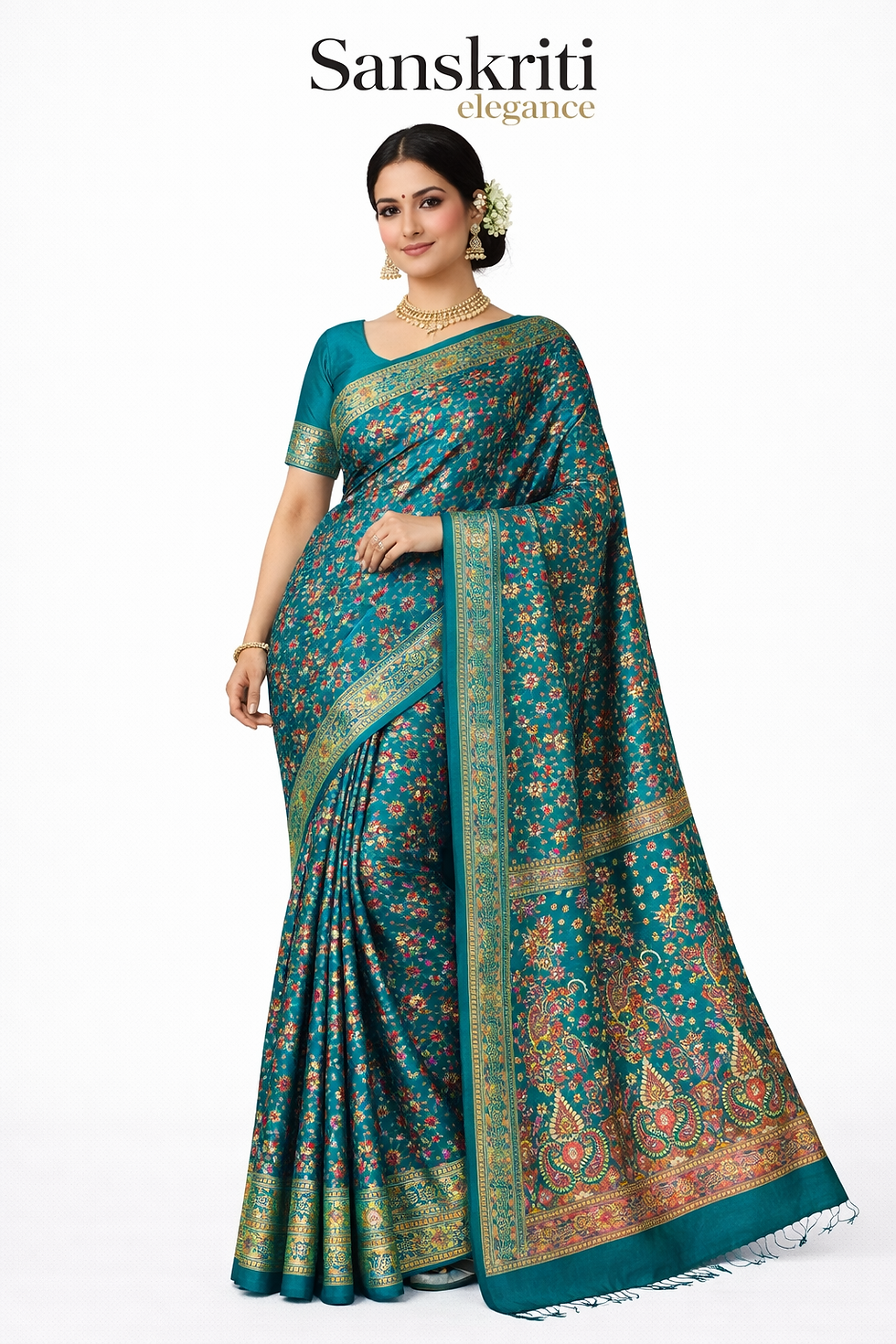 Peacock Blue Cotton Silk with All-Over Print & Zari Border