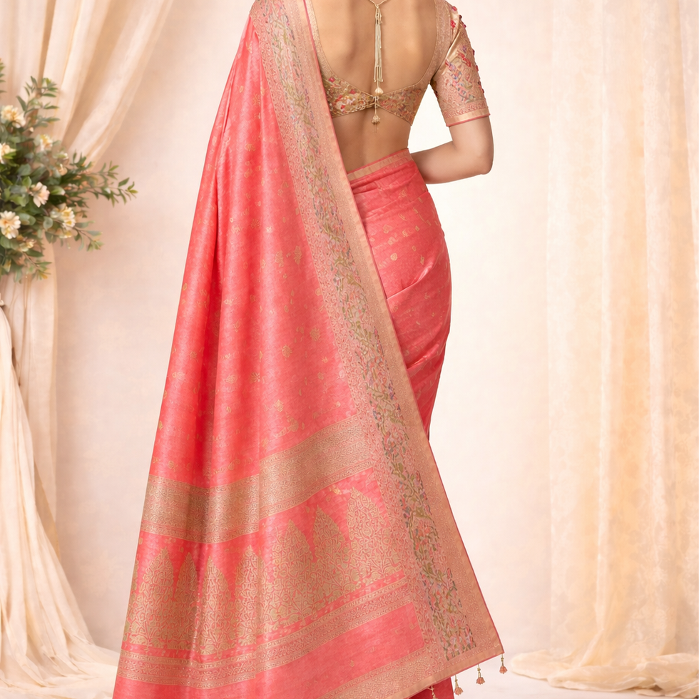 Add a touch of grace to your wardrobe with this stunning Peach Cotton Silk Banarasi Saree, designed to reflect elegance and timeless tradition. Crafted from a premium cotton silk blend, this saree offers a soft, lightweight feel with a luxurious woven texture, perfect for both comfort and style.