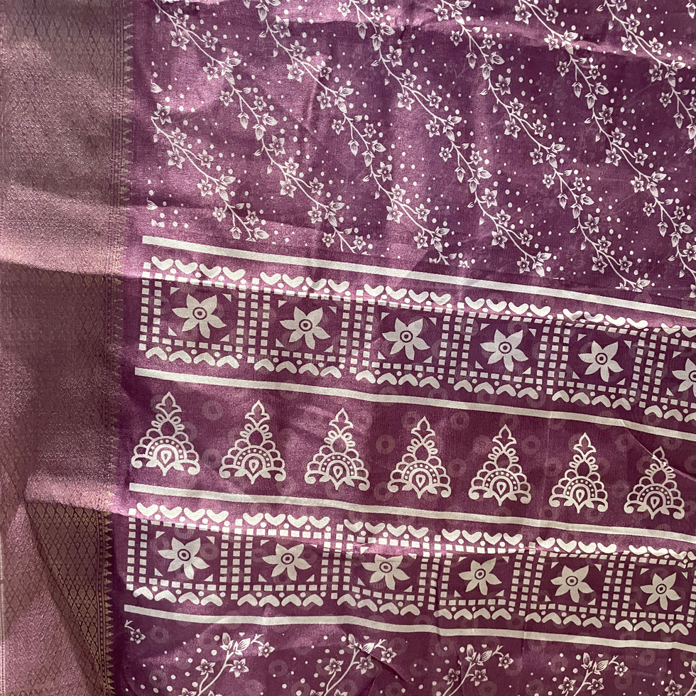 Purple Organza Silk Saree with White All-Over Print & Golden Zari Woven Border