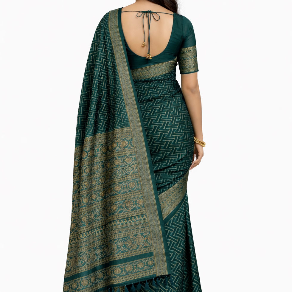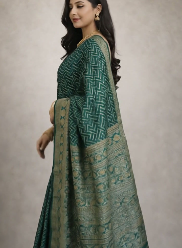 Add timeless charm to your ethnic collection with this stunning Green Organza Silk Saree, designed to blend contemporary patterns with traditional craftsmanship. Crafted from premium organza silk, this saree is lightweight, soft, and carries a graceful sheen that enhances its rich appearance.