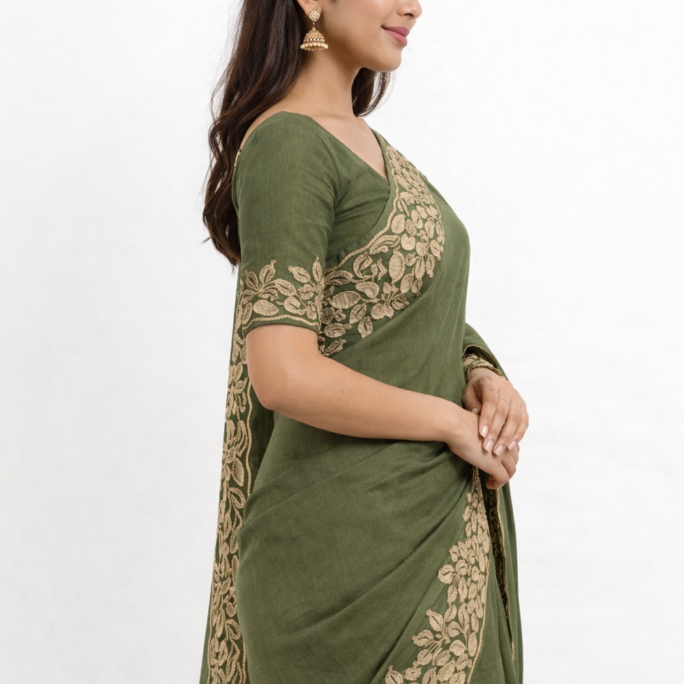 It is paired with a matching blouse in the same fabric and color, designed with embroidery detailing on the back and sleeves border, enhancing the overall ensemble with a designer finish.