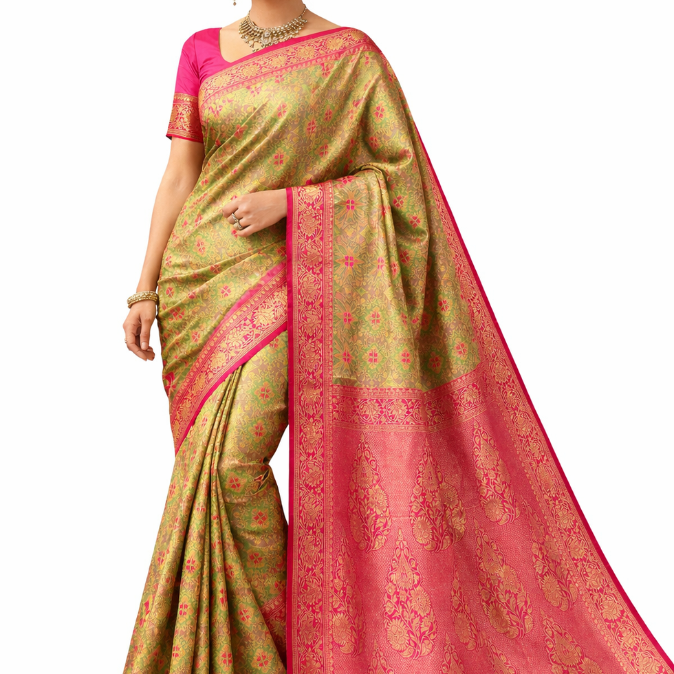 Mehndi Green Kanjivaram Silk Banarasi Saree with Rani Pink Zari Border & Pallu