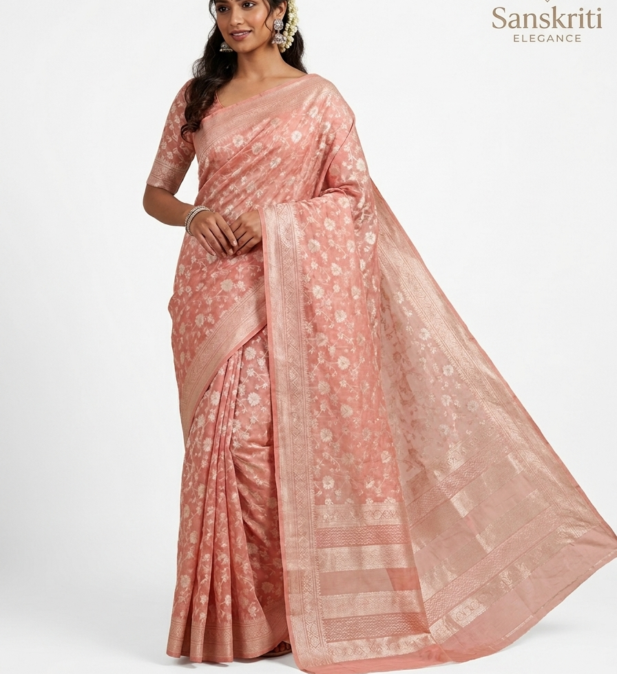 Paired with a matching peach unstitched blouse featuring full weaving and a stylish sleeve border, this saree ensures a coordinated and polished ethnic look. A perfect blend of simplicity and luxury, this piece from Sanskriti Elegance is ideal for women who love understated beauty with a traditional touch.