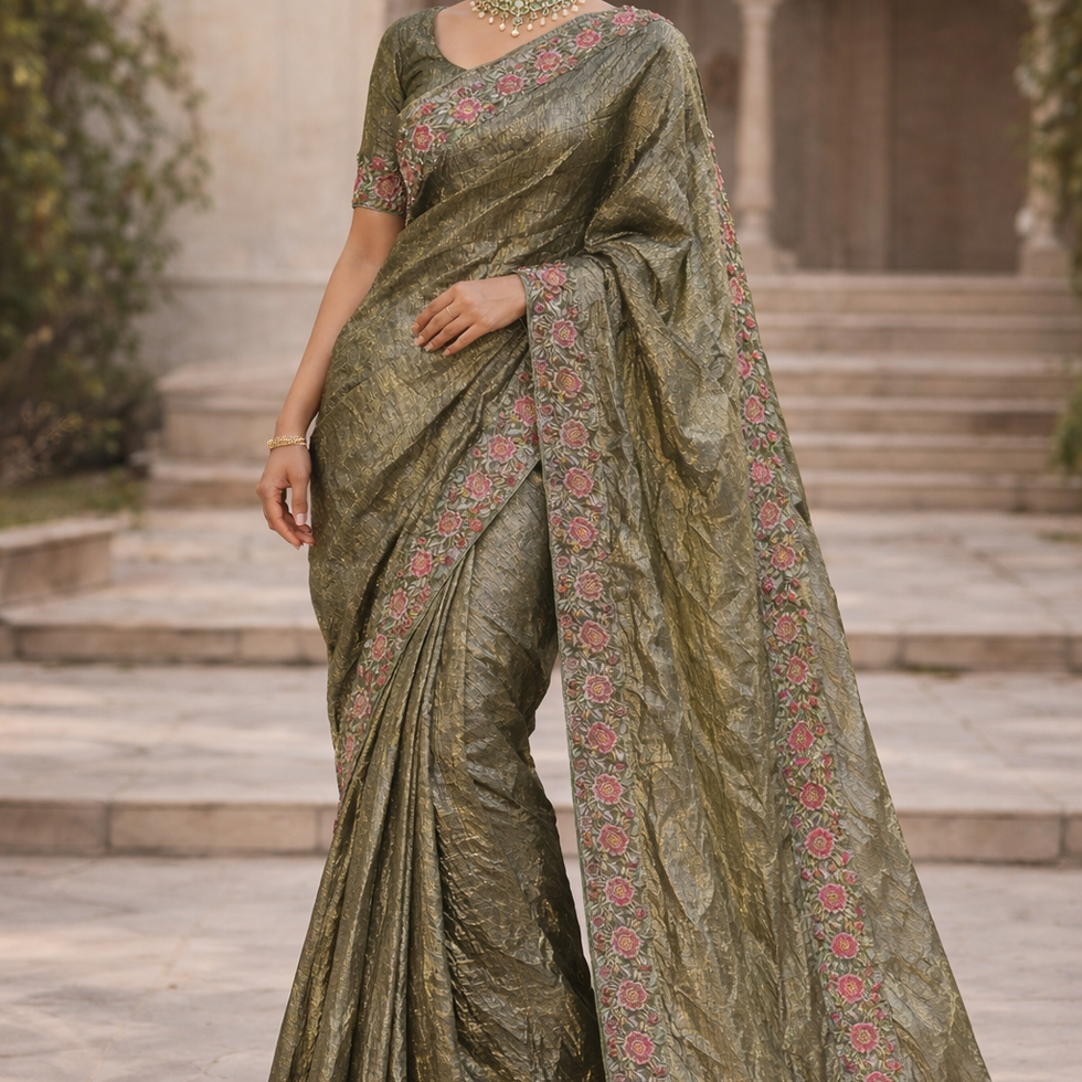 Elevate your ethnic wardrobe with this elegant Soft Crush Tissue Silk Saree from Sanskriti Elegance. Crafted in a soothing mehndi green shade, this saree features a rich plain body enhanced with intricate full cutwork embroidery on the border and pallu, giving it a luxurious and timeless appeal.